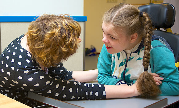 blonde woman wearing glasses sat at desk behind laptop